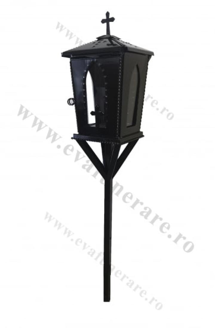Felinar funerar din tabla model A cu pereti din sticla si picior metalic, 3 pereti din sticla si 1 perete din tabla, ideal pentru candele cu parafina sau ulei, inaltime candela cca. 20 cm, Detinem o gama diversificata de modele si culori. Produsele se afla pe stoc. Putem livra si in provincie. Acceptam plata si in rate fixe fara dobanda.